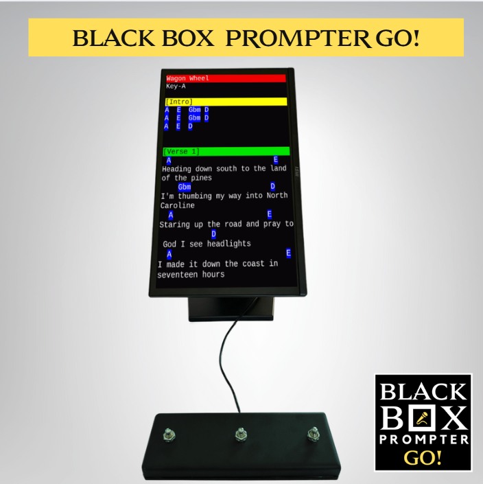 – the all-new BLACK BOX Prompter GO! delivers the full power of Black Box Rocks! software in a sleek, portable design that weighs just 8 lbs and fits easily in a carry‑on backpack  for your next show (and small enough you can even travel with it on a flight). With an adjustable tilt mount and included Heavy Metal Pedal, it’s built for musicians and presenters on the move.