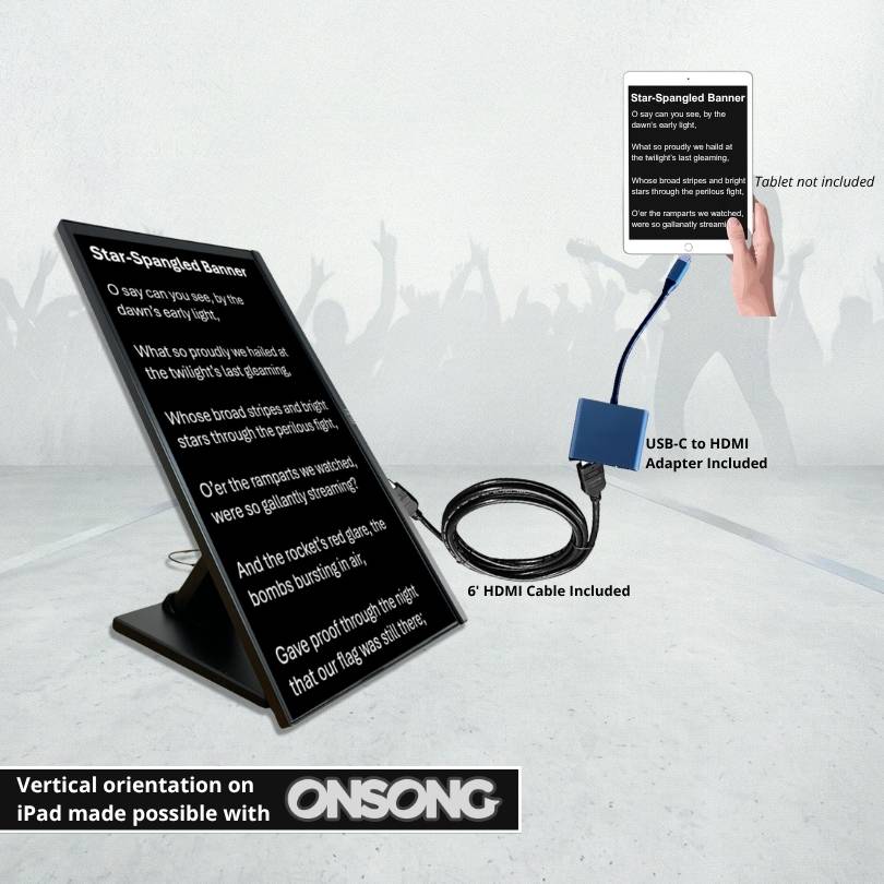 The Mirror GO! delivers sharp, vivid text on a crisp 22″ LED display — ideal for singers, guitarists, presenters, and worship leaders who need reliable on-the-go prompting when mirroring their tablet, laptop, or smartphone. Full USB-C compatibility with both iPadOS and Android devices means it fits seamlessly into whatever workflow you already have.